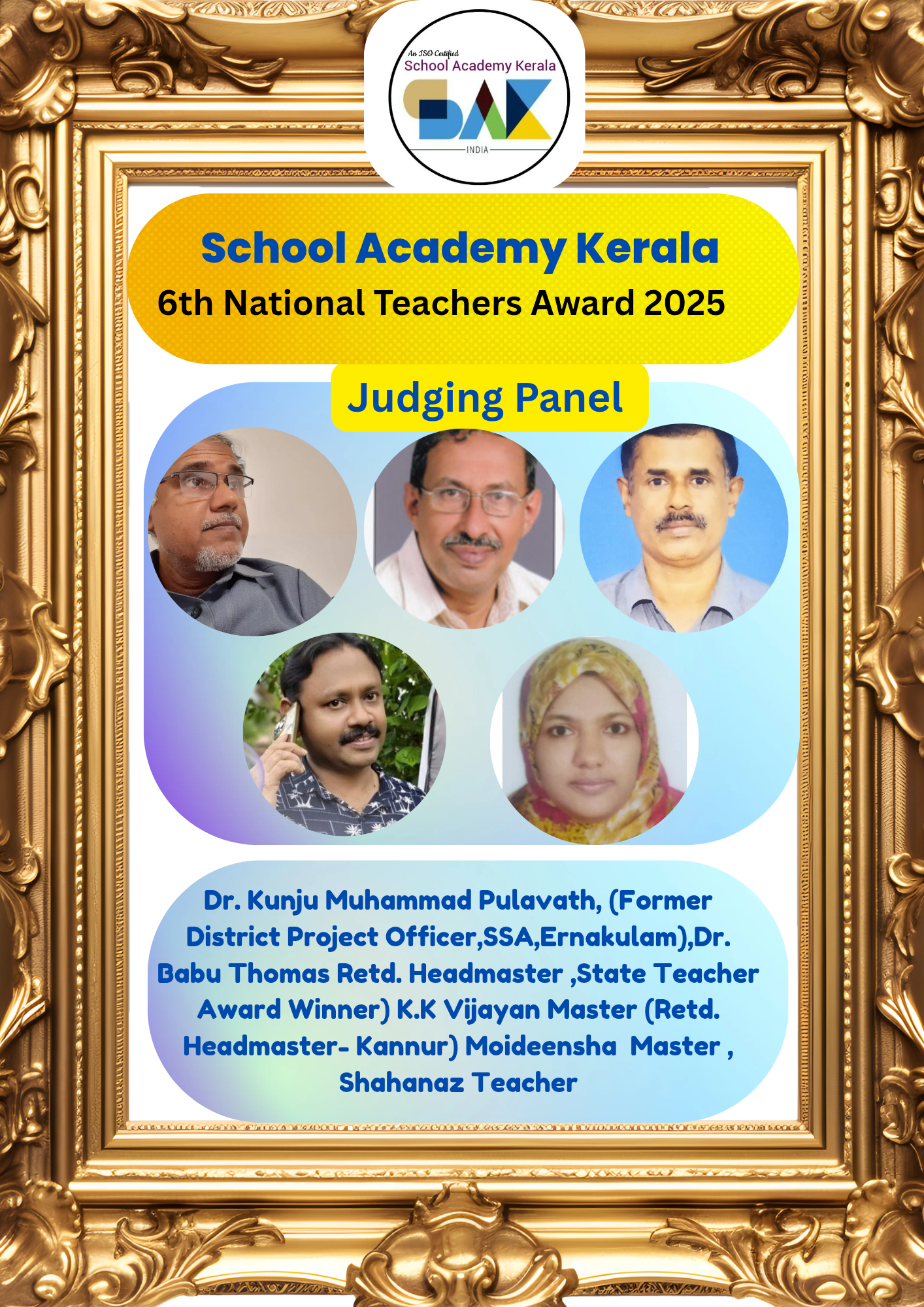 ഡോ. കുഞ്ഞുമുഹമ്മദ് പുലവത്ത് എറണാകുളം (റിട്ടയേഡ് എസ് എസ് എ ജില്ലാ പ്രോജക്ട് ഓഫീസർ) ഡോ. ബാബു തോമസ് ആലപ്പുഴ (റിട്ടയർ.ഹെഡ്മാസ്റ്റർ, സംസ്ഥാന അധ്യാപക അവാർഡ് ജേതാവ്) കെ കെ വിജയൻ മാസ്റ്റർ കണ്ണൂർ (റിട്ടയർ ഹെഡ്മാസ്റ്റർ) മൊയ്തീൻ ഷാ മാസ്റ്റർ, ഷഹനാസ് ടീച്ചർ എന്നിവരടങ്ങുന്ന അഞ്ചുപേരെയാണ് വിധികർത്താക്കളായി തിരഞ്ഞെടുത്തിട്ടുള്ളത്.